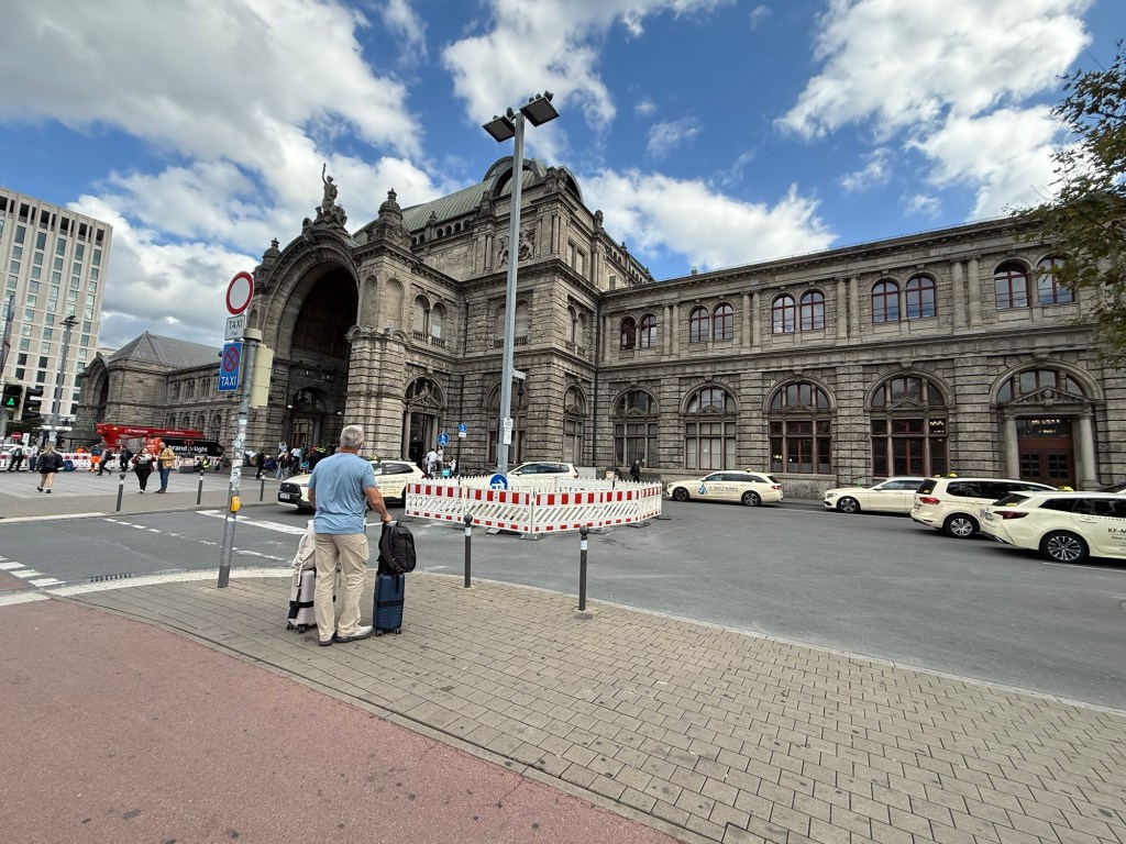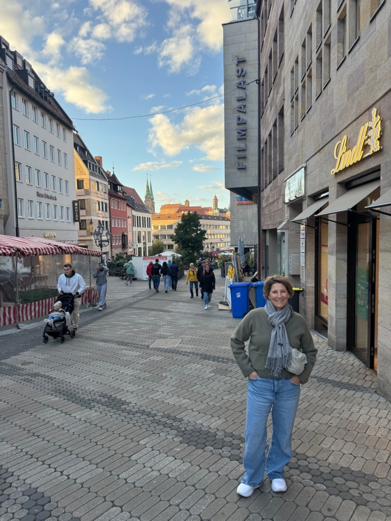 We arrived at the train station in plenty of time for the train to Nuremberg. We have first class tickets through Europass. Unless you have a reserved seat you have to figure out which seats are already reserved. Yes, I have tried to figure that out but am not there yet. Today we rushed into the train (because they don’t wait) and grabbed 2 seats. This is where our seating lesson began. We were immediately schooled on which seats were reserved. On the sides of the seats show which legs the seat is reserved for. So don’t sit in those! There are 2 first class cars with lots of seats. All reserved, so you have to walk down the aisle like your from 4th class and look for a seat, if you have not figured out reservations yet. We found 3 quiet rooms with 6 opposing seats in each room. 2 of the rooms had people in them with luggage strewn out to discourage entrance. The 3rd room was empty so taking a lesson from the other two, we scattered our luggage to discourage entry. We must have missed something because 2 people forced their way in past our luggage and sat down. I even forced the malfunctioning door closed to make it harder to enter. No luck. A rather long legged man and woman made themselves at home. I sat across from Lurch. He sprawled his legs out in an exaggerated man spread encroaching on my space and activating my claustrophobic mental alarm. Lori never seems to be bothered by people in our space but she will bring it up between us. The room is a quiet room that is placarded with silence sticker. He must not have been able to read pictograms because he began rambling on his phone almost immediately. I leaned over to Lori to look for approval to point out the quiet sticker on the door. Her look said it all, NO INTERNATIONAL INCIDENTS!