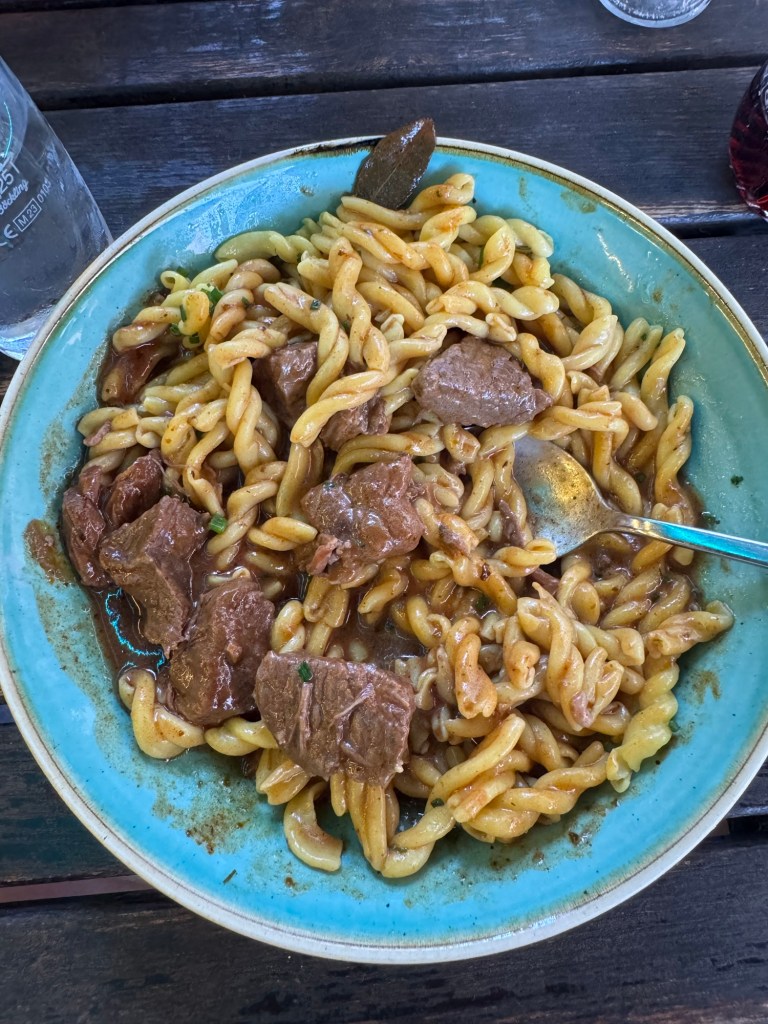 We decided to do a little exploring in the old part of town. The new part of town was bombed in WWII by the allies and is now considered new. The old part has a very large castle and many old churches. We found a small restaurant and had Goulash and Spatzle which is dumpling like noodles with cheese and onion. The Goulash was delicious and similar to beef stroganoff! We found another Rick Steves audio tour and started that. It led us right into another Oktoberfest which was pretty nice and a lot smaller than Munich. The audio tour weaved in and out of the festival. We reached a locked gate that lead to a cemetery. Also on the tour but the gate was locked. There were some people on the other side trying to get out while we were trying to get in. I think we had the better situation. We figured that we had never seen anyone dead above ground in a cemetery so…. We tried to finish out the tour but wandered into a “super cute” part of town where we ended the tour. We walked around for a while and bussed back to the hotel. Bussing was free for 3 days so that worked perfect.