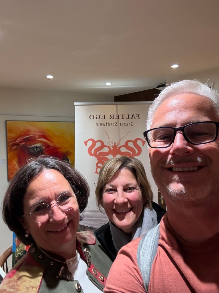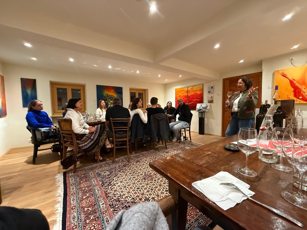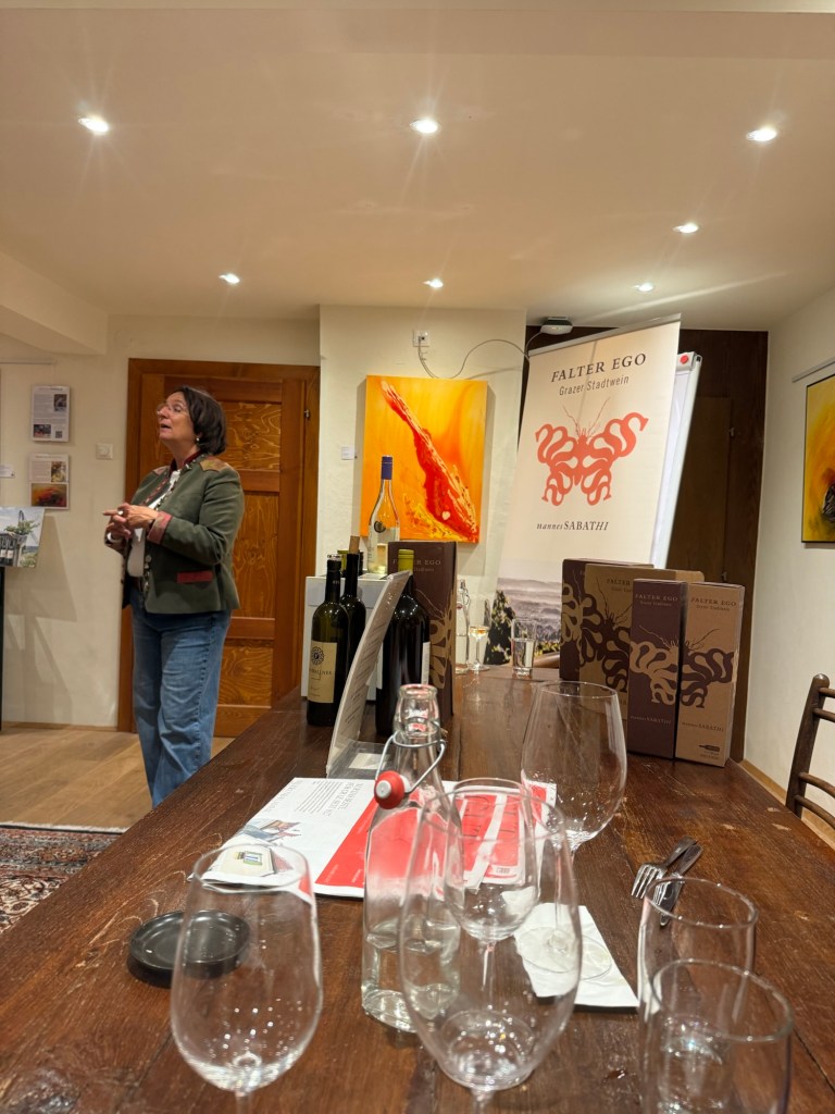 Our scenic train ride and lazy day did not work out that way. Lori spotted a “cute” section of town so the walking began. We were staying in a hotel that was in the old part of town and was a walled city. You have to enter through a main gate and there is actually a wall surrounding that part of town. We found a wine bar that offered samples so we bought 3 samples. One of the samples was an old bottle. Believe me, we know what an old bottle smells like. They tried to tell us that it is just the notes of the wine which I have to call bullshit on. No wine should smell like wet cardboard! We left that glass, paid and left. We found another wine place down the street and were looking for a particular wine that we had at the earlier restaurant. The guy at the counter asked if we wanted to try a couple different red wines. We accepted. Then he came back and told us that they were about to start a wine tasting with a group up stairs and that he would ask if we could join. We enthusiastically accepted. The whole group of about 10 people sat at one table and we sat a what seemed like the kiddy table. They offered up 6 white wines and paired them with some nicely prepared dishes. The lady (Gabby) that was presenting spoke German and English and introduced everything in both languages. At the end we sat and talked with her as everyone else left. She sat with us and drank some red wine and talked for over an hour. So much for the relaxing, do nothing day. It was worth it though!. We had a great conversation and learned about some places that we should visit as we head to Croatia tomorrow.