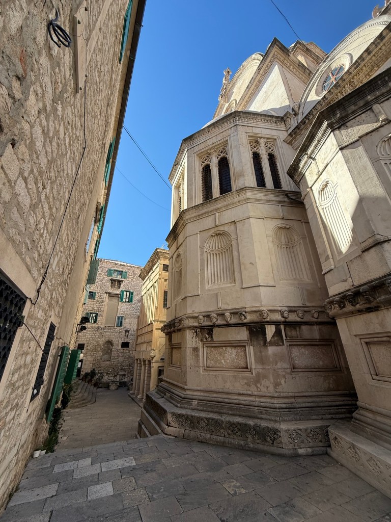 We made some eggs with bread and Parmesan cheese slices and prepped for the climb ahead. It started out easy as we walked DOWN the steps to the second alley way. Our landlord told us that it was the easiest way into to the city via St Michael’s Fortress. Our hips and legs quickly stiffened up and the climb was coming into question. Did we make a wrong turn? Should it be this difficult? As Lori trailed behind she asked what I wanted to see exactly? I said that I wanted to see St. John’s Fortress which is the highest point in Sibenik. Lori did not seem excited about the walk and suggested that we split up today so that she could shop without making me stand guard. Very considerate I thought it was she ditching me?