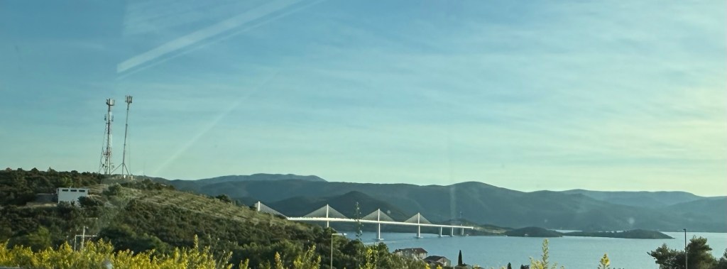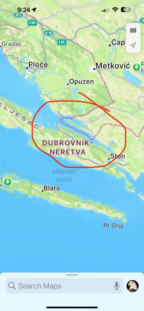 About a minute down the road we crossed a large bridge that routed us over to a peninsula that avoids Bosnia. The country boundaries are crazy in this region. Croatia owns most of the coast line in front of Bosnia on the Adriatic Sea. Then Bosnia owns a small portion then Croatia picks up again with a thin strip of coast. It is easier to see on a map which I included. I am curious to know the story behind the boundary lines and why they are drawn the way they are.