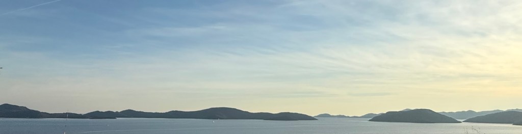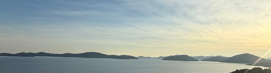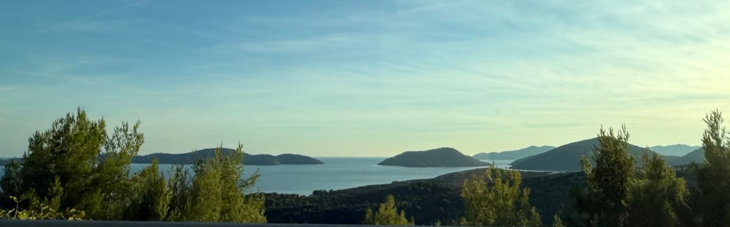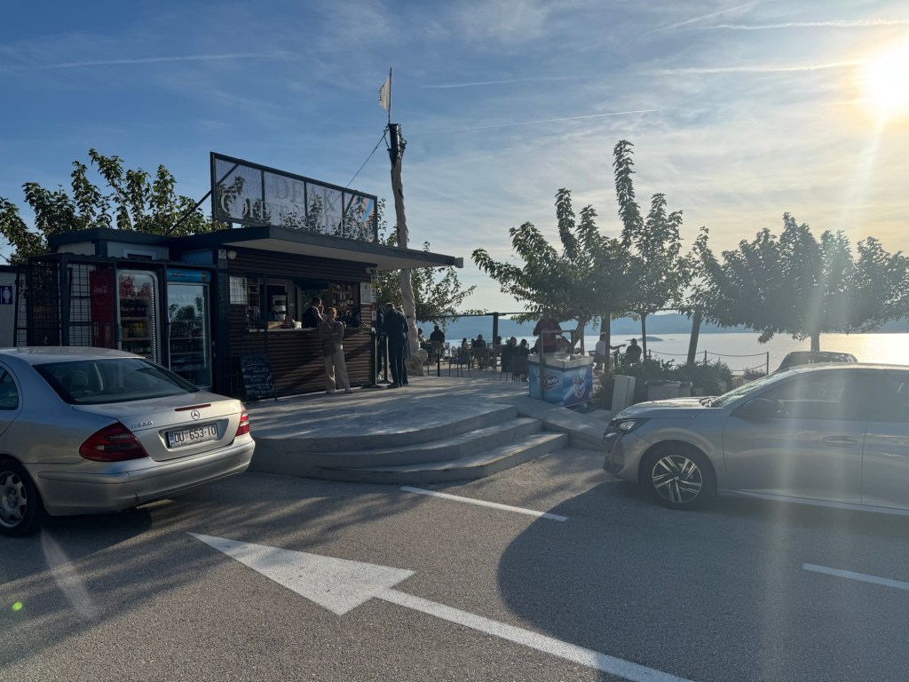They parked us on the top row above the buses and other cars. It is amazing how many vehicles that they can fit on these things. We exited the ferry and headed south for Dubrovnik. We decided to take the more direct route instead of along the coast. It was still beautiful! This country has surpassed Italy as our favorite country. The scenery is awesome, there is no litter, the roads are well maintained and the food is delicious. We stopped about an hour outside of Split for lunch and had pizza. We continued on for another hour enjoying the mountain scenery. We came around a mountain bend and spotted a coffee and wine stand overlooking a bay with several islands. Lori yelled out “super cute” whip in there! I followed the command and executed the maneuver. I was able to avoid a roll over and make it into the parking lot unscathed. This is a popular stopping point as the parking lot was already packed. This place was a gold mine! Lori purchased some coffee and we sat and enjoyed the view for about 20 minutes.