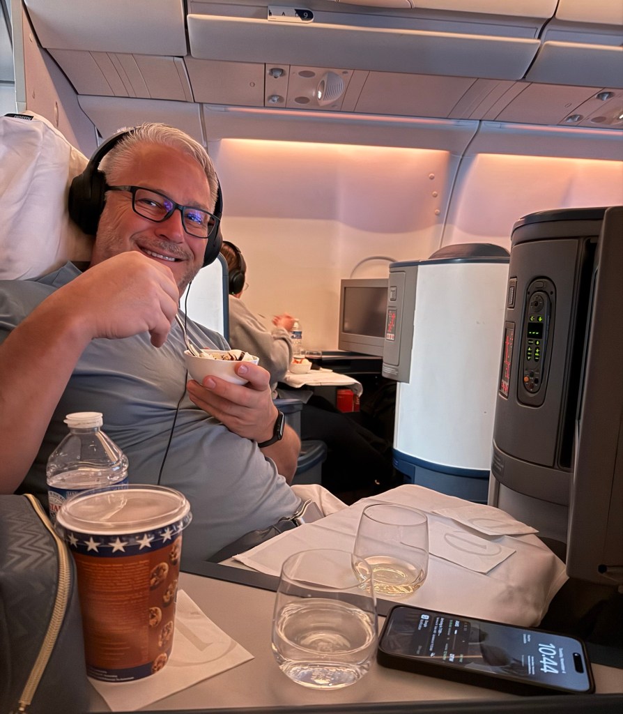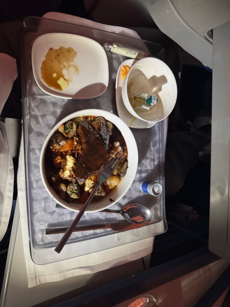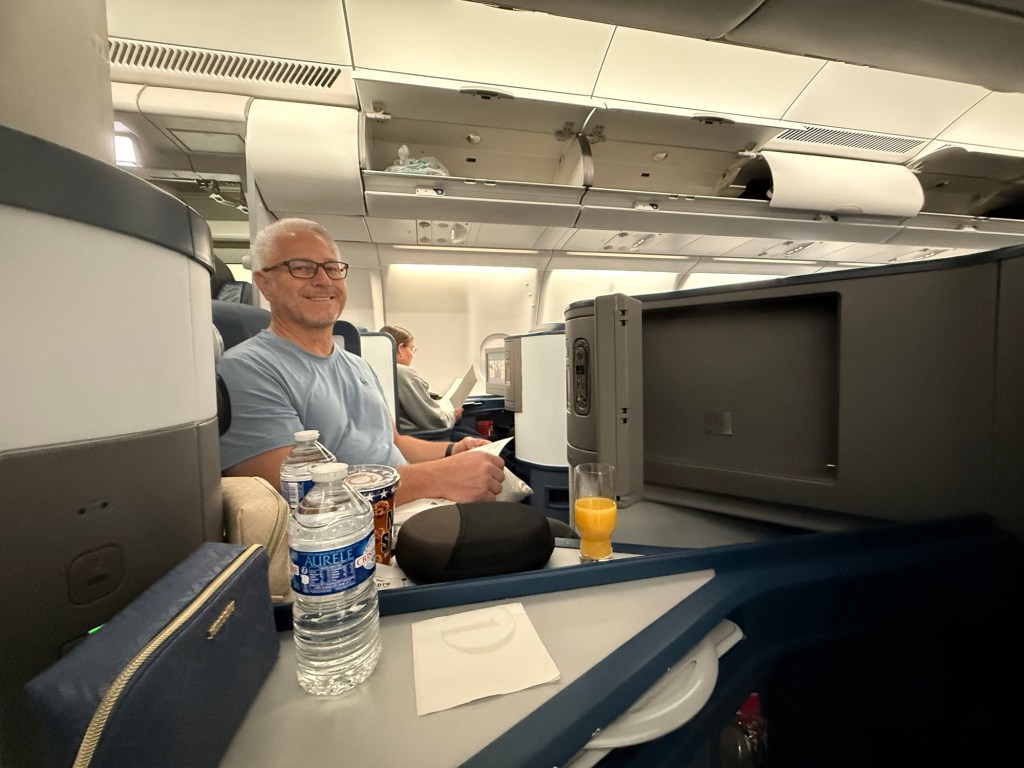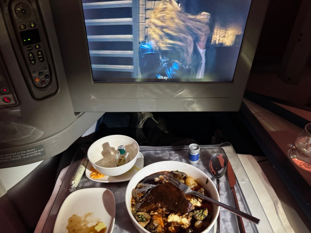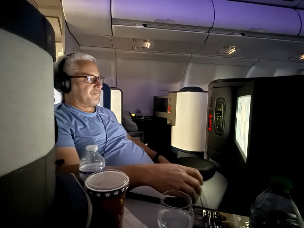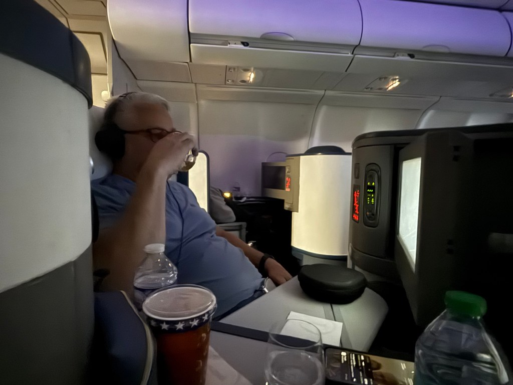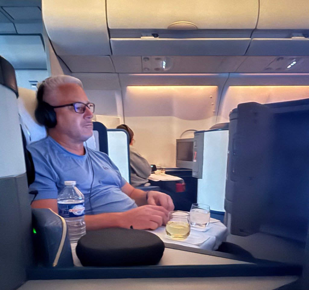 After she took everyone’s order a drink cart appeared next to me. I ordered a glass of white wine. She offered me 2 choices and let me sample it before I decided. She then handed me a bowl of warm mixed nuts. I turned on the new Superman movie and plugged in my headphones. Before I knew it she was back and topping off my drink. These were some heavy pours and we were still sitting at the gate loading passengers. It seemed like every time I turned on the movie they were back asking if I needed anything. It was teetering on annoying but the added drinks help to soothe that. The attendant on my side of the plane was very efficient. Lori’s attendant not so much. Which was pretty funny. They made the announcement that we were ready to take off. The attendant returned and moved my chair into the upright position. I don’t like bucking the rules so I told her that I didn’t even know that it was not fully upright. She responded “yea, you just found it that way”. I laughed and said yea, I did. She had a pretty funny sense of humor. She continued to keep my wine glass filled throughout the flight.