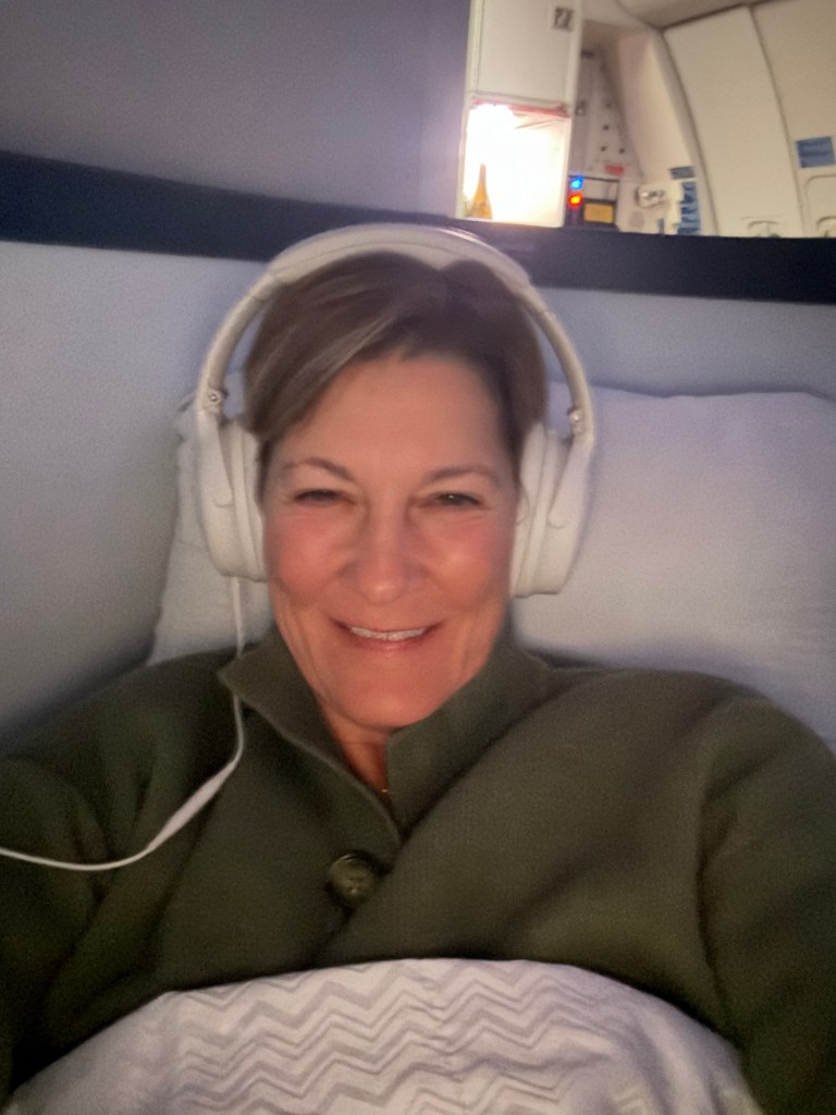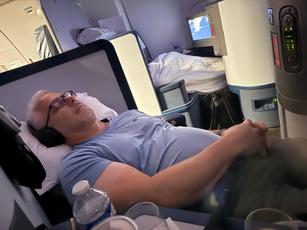 The attendant arrived to pick up my clean ice cream bowl. She asked why I didn’t lick it clean and I responded because I could not fit my head in the bowl. I think she liked messing with the new guy. Each interaction caused me to pause the Superman movie. Maybe this is their way to make a movie last 8 hrs. She stopped by again and asked why my drink was empty. I said because the attendant is slacking! That was all I needed to say. She kept my glass full until I fell asleep. Lori even started asking her for coffee from my attendant. I told her that she needed to stay on her side of the plane.