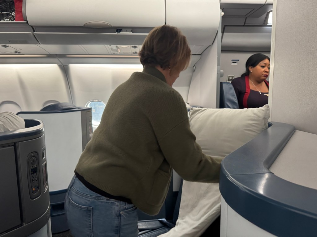 We took off and then were allowed to install our seat padding. This is a full length pad because the seats fold down into a bed and completely flat. So I guess it makes sense to have a mattress pad. The seat itself had numerous seat positions that were all electrically controlled. These included lumbar support, foot rest, knee elevation and full flat position. You didn’t even need to stand up with so many positions to choose from. Just moving the seat was exercise enough.